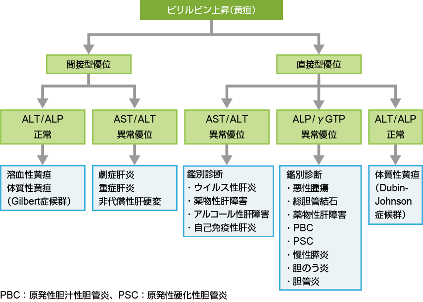 ビリルビン上昇(黄疸)を示す症例について、間接型優位、直接型優位に分け、フローチャートに従い鑑別する。