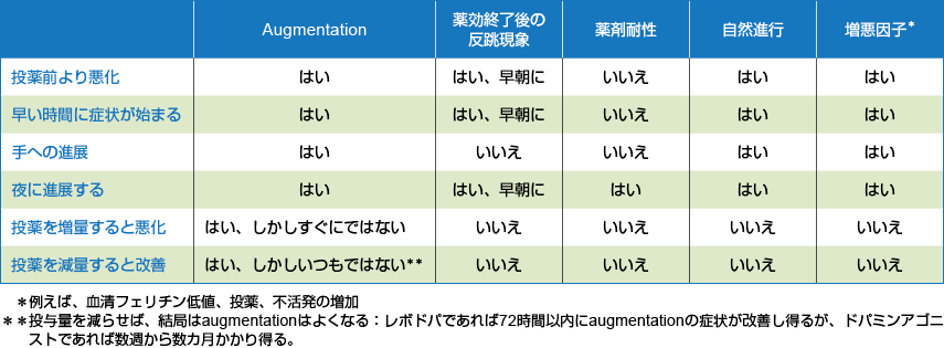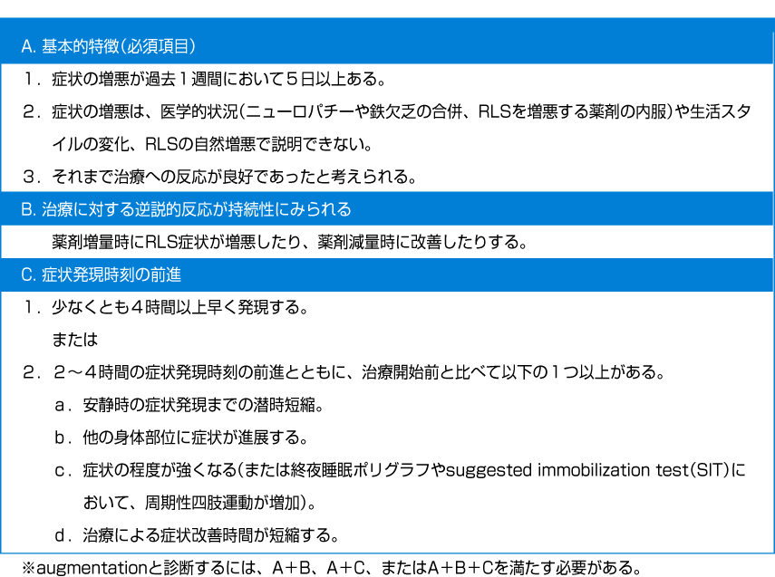 Abstract/Text: A Task Force was established by the International Restless Legs Syndrome Study Group (IRLSSG) in conjunction with the European Restless Legs Syndrome Study Group (EURLSSG) and the RLS Foundation (RLS-F) to develop evidence-based and consensus-based recommendations for the prevention and treatment of long-term pharmacologic treatment of dopaminergic-induced augmentation in restless legs syndrome/Willis-Ekbom disease (RLS/WED). The Task Force made the following prevention and treatment recommendations: As a means to prevent augmentation, medications such as α2δ ligands may be considered for initial RLS/WED treatment; these drugs are effective and have little risk of augmentation. Alternatively, if dopaminergic drugs are elected as initial treatment, then the daily dose should be as low as possible and not exceed that recommended for RLS/WED treatment. However, the physician should be aware that even low dose dopaminergics can cause augmentation. Patients with low iron stores should be given appropriate iron supplementation. Daily treatment by either medication should start only when symptoms have a significant impact on quality of life in terms of frequency and severity; intermittent treatment might be considered in intermediate cases. Treatment of existing augmentation should be initiated, where possible, with the elimination/correction of extrinsic exacerbating factors (iron levels, antidepressants, antihistamines, etc.). In cases of mild augmentation, dopamine agonist therapy can be continued by dividing or advancing the dose, or increasing the dose if there are breakthrough night-time symptoms. Alternatively, the patient can be switched to an α2δ ligand or rotigotine. For severe augmentation the patient can be switched either to an α2δ ligand or rotigotine, noting that rotigotine may also produce augmentation at higher doses with long-term use. In more severe cases of augmentation an opioid may be considered, bypassing α2δ ligands and rotigotine.