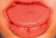 口唇の粘膜面が特に赤みがつよく、乾燥している。また一部から出血している。