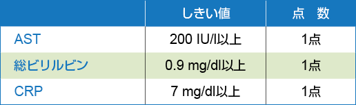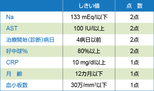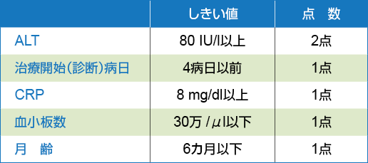 スコア2点以上でヒト免疫グロブリン大量療法に対する不応例を感度77%、特異度86%で予測できると報告されている。なお、一度陽性になった点数については、初診時から診断時まで加点し続けることに留意する。
