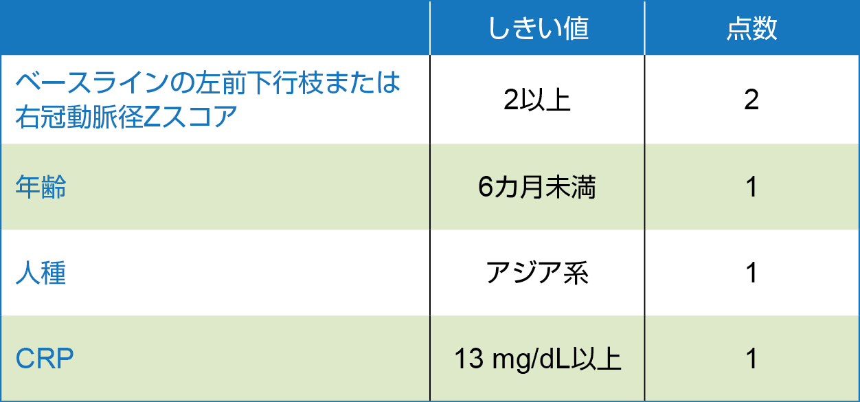 Sano T et al. Prediction of non-responsiveness to standard high-dose gamma-globulin therapy in patients with acute Kawasaki disease before starting initial treatment. Eur J Pediatr. 2007 Feb;166(2):131-7. PMID: 16896641.