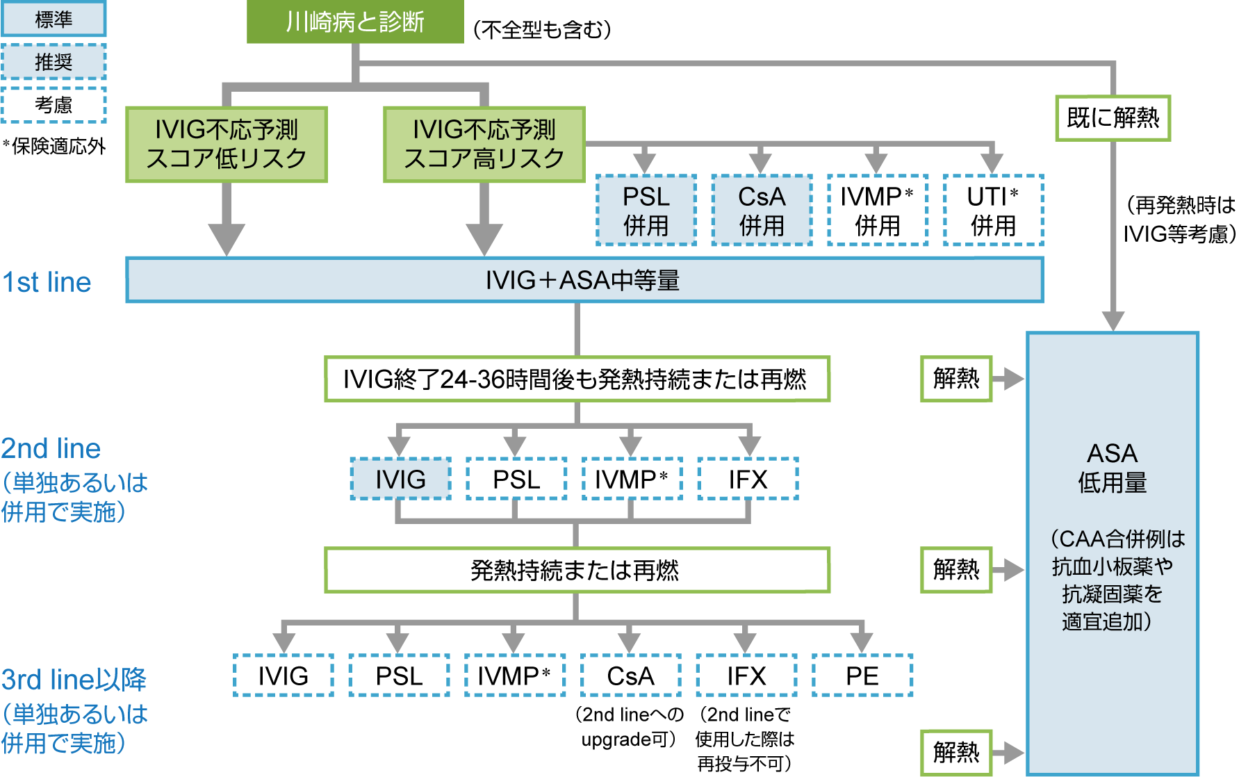 各時相(line)における標準的な治療、推奨する治療、考慮してもいい治療を示した。ASA:アスピリン、CsA:シクロスポリンA、IFX:インフリキシマブ、IVIG:免疫グロブリン大量療法、IVMP:ステロイドパルス、PE:血漿交換、PSL:プレドニゾロン、UTI:ウリナスタチン