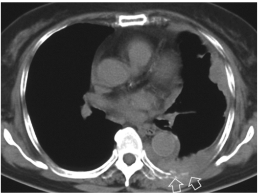背部の胸膜腫瘍は、胸膜下脂肪織を超え、肋骨を浸潤し、胸壁に高度に浸潤している(矢印)。