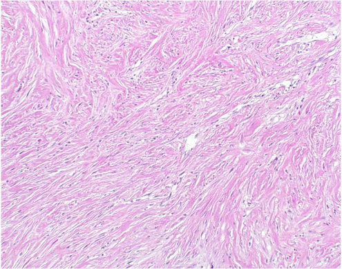膠原線維が束状配列や花むしろ様配列を呈して増生し、その中に紡錘形細胞をみる。細胞密度が低く、細胞異型も乏しいので、良性の線維性胸膜炎との鑑別に注意が必要である。