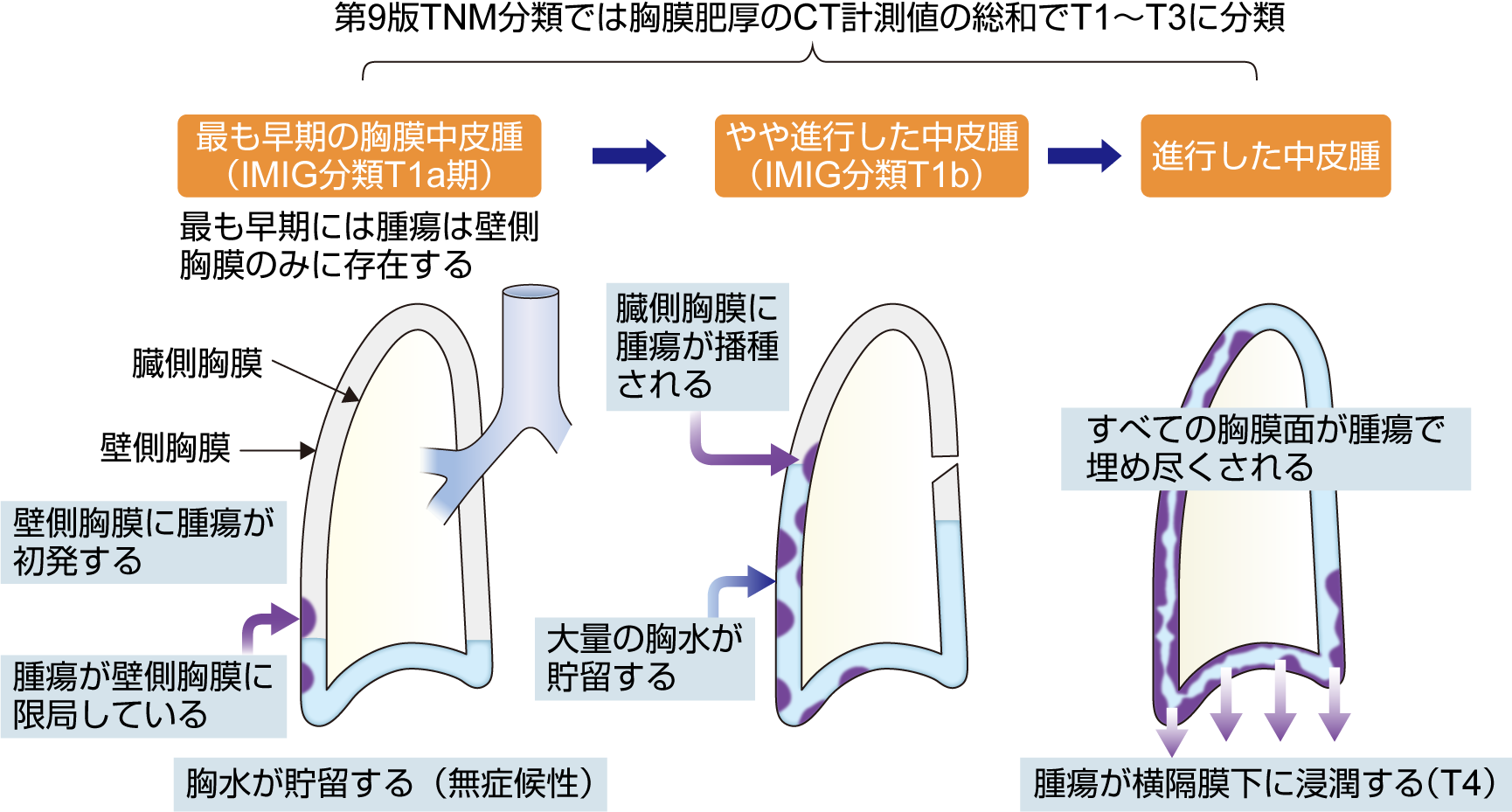 胸膜中皮腫は壁側胸膜の顆粒状腫瘍として初発するが、極めて早期には胸腔鏡検査で腫瘍の存在が確認できない“mesothelioma in situ”の時期がある。Mesothelioma in situでは胸水貯留がみられるが、貯留と消退を繰り返すこともある。臨床的に初めて腫瘍が確認されるのは壁側胸膜であり、早期には腫瘍は壁側胸膜に限局し、臓側胸膜に腫瘍はみられない(IMIG分類T1a)。胸水貯留は発症初期から認められるが、無症候性である。胸水は大量に貯留することもあるがTNM分類に胸水の規定はない。次に、腫瘍は臓側胸膜面に播種される(IMIG分類T1b)。この時点では壁側および臓側胸膜に腫瘍結節を認めるが、正常胸膜面も存在している。やがて葉間胸膜を含むすべての胸膜を腫瘍が埋め尽くすようになる(T2)。また腫瘍は、横隔膜を浸潤し、やがて腹腔に達する(T4)。なお、IASLCの第8版 TNM分類では、T1aとT1bの区分をなくして、両者を合わせてT1とし、第9版では胸膜肥厚のCT計測となった。