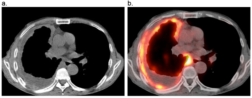 b:FDG-PETでは肥厚した胸膜に陽性所見がみられる。
