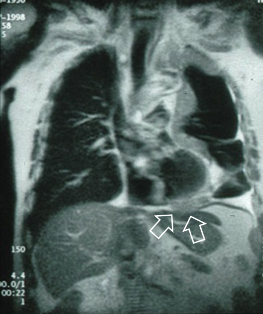 MRI像では腫瘍が横隔膜下に達していることが確認できる(T4)。