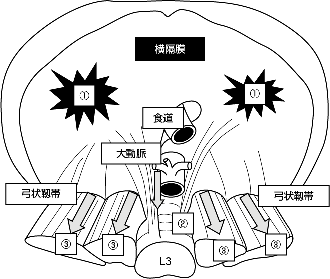 ②下行大動脈壁に沿って進展し大動脈裂孔を経て腹腔に達する経路