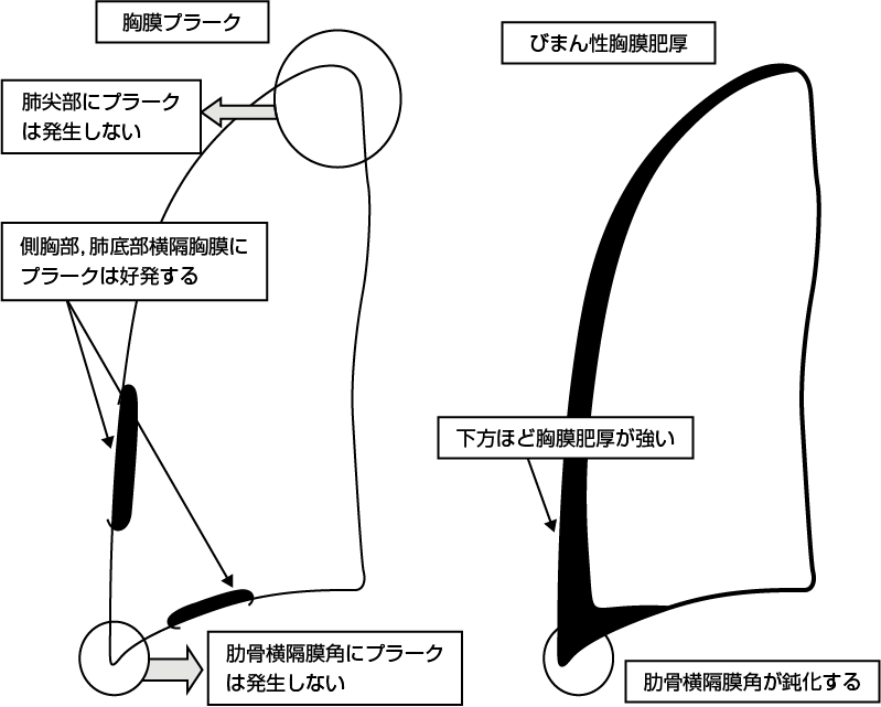 胸膜プラークは、肋骨胸膜、横隔胸膜に好発するが、肺尖部および肋骨横隔膜角には発生がみられない。臓側胸膜の肥厚である“びまん性胸膜肥厚”は下方(足方)ほど肥厚の程度が強く、肋骨横隔膜角に鈍化がみられる。