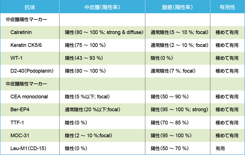 上皮型中皮腫と腺癌との鑑別に有用な中皮腫陽性マーカーと陰性マーカー