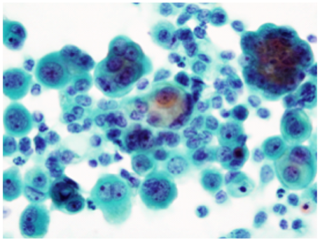 まりも状の大型細胞集塊と比較的多くの二核細胞が認められる。