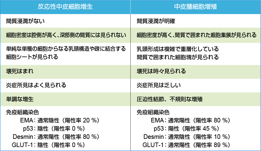 アスベスト関連胸膜疾患の増加と胸腔鏡検査の普及に伴ってきわめて早期の悪性胸膜中皮腫(mesothelioma in-situ)と考えられる症例が増えているため、反応性中皮細胞増生と中皮腫細胞増殖の鑑別は臨床的に重要である。中皮細胞が反応性に増生すると、異型性を伴うようになり、atypical mesothelial hyperplasiaと表現される像を呈するようになる。原因は感染、膠原病、肺梗塞、薬剤、気胸、胸膜直下の肺癌などである。細胞密度は、胸腔側に高く、深部側の間質にはみられないのに対して、中皮腫では細胞密度が高く、間質で囲まれた細胞集簇があり、免疫染色ではp53(45%)、EMA(80%)、GUT-1(90%)に陽性所見を示す。一方、反応性中皮細胞増生では通常これらは陰性である。