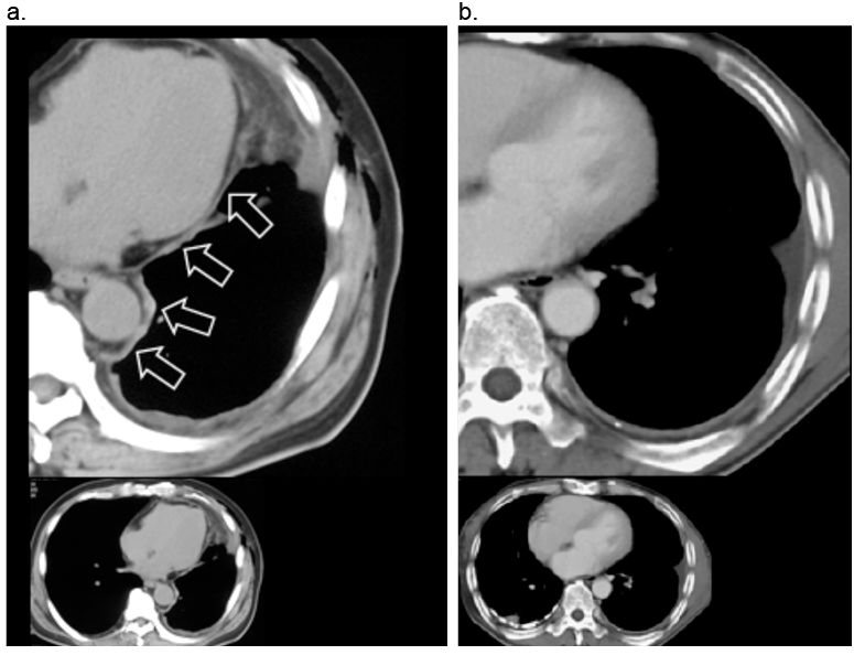 中皮腫では縦隔胸膜に肥厚がみられる(a)が、良性石綿胸膜炎では肥厚がみられない(b)。