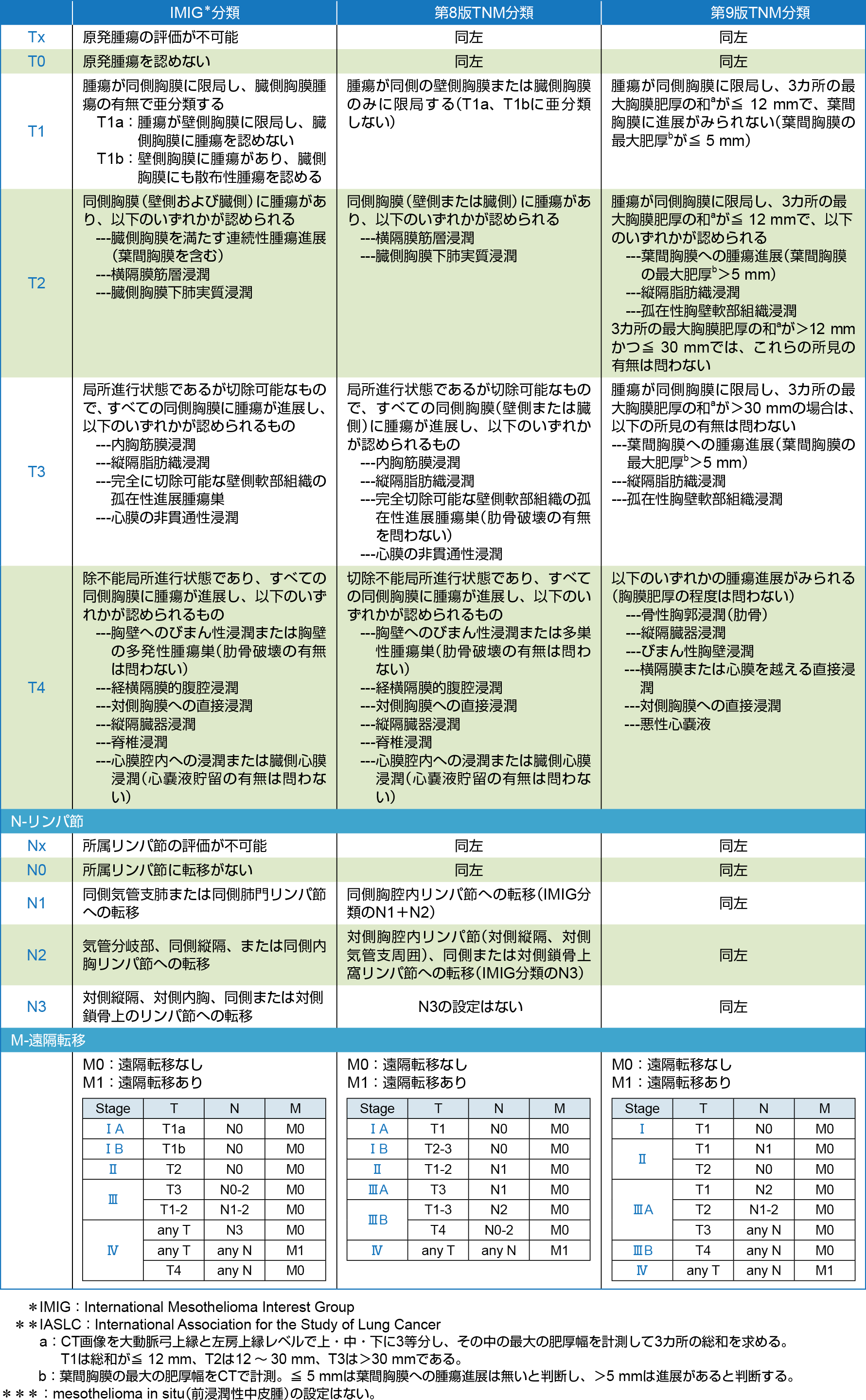 IMIG*分類(第7版 AJCC/UICC TNM分類) 第8版TNM分類(IASLC**)、第9版TNM分類(IASLC**)の対比