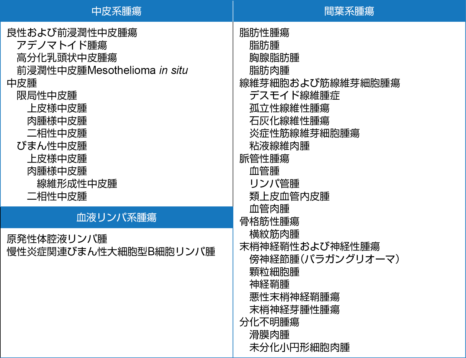 1: 日本肺癌学会編:肺癌診療ガイドライン2024年版. 悪性胸膜中皮腫. 胸膜腫瘍の組織分類(WHO分類, 2021). p384. 金原出版. ※本著作物は日本肺癌学会が作成したものであり、本著作物の内容に関する質問、 問い合わせ等は日本肺癌学会にご連絡ください。エルゼビア・ジャパン株式会社は、日本肺癌学会及び発行元である金原出版から許諾を得て、本著作物を内容の改変を行うことなく複製し、使用しています。
