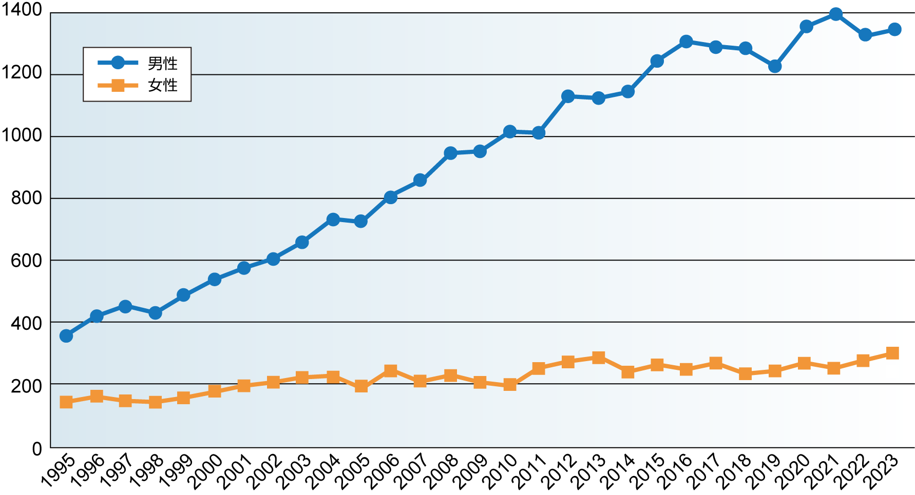 日本の中皮腫死亡の年次推移(1995~2023年)