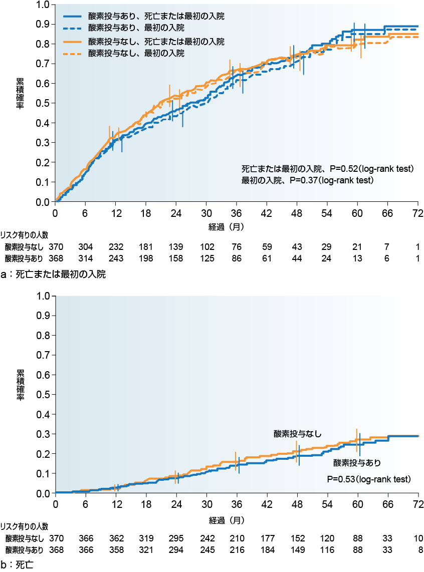 RESULTS: A total of 738 patients at 42 centers were followed for 1 to 6 years. In a time-to-event analysis, we found no significant difference between the supplemental-oxygen group and the no-supplemental-oxygen group in the time to death or first hospitalization (hazard ratio, 0.94; 95% confidence interval [CI], 0.79 to 1.12; P=0.52), nor in the rates of all hospitalizations (rate ratio, 1.01; 95% CI, 0.91 to 1.13), COPD exacerbations (rate ratio, 1.08; 95% CI, 0.98 to 1.19), and COPD-related hospitalizations (rate ratio, 0.99; 95% CI, 0.83 to 1.17). We found no consistent between-group differences in measures of quality of life, lung function, and the distance walked in 6 minutes.
