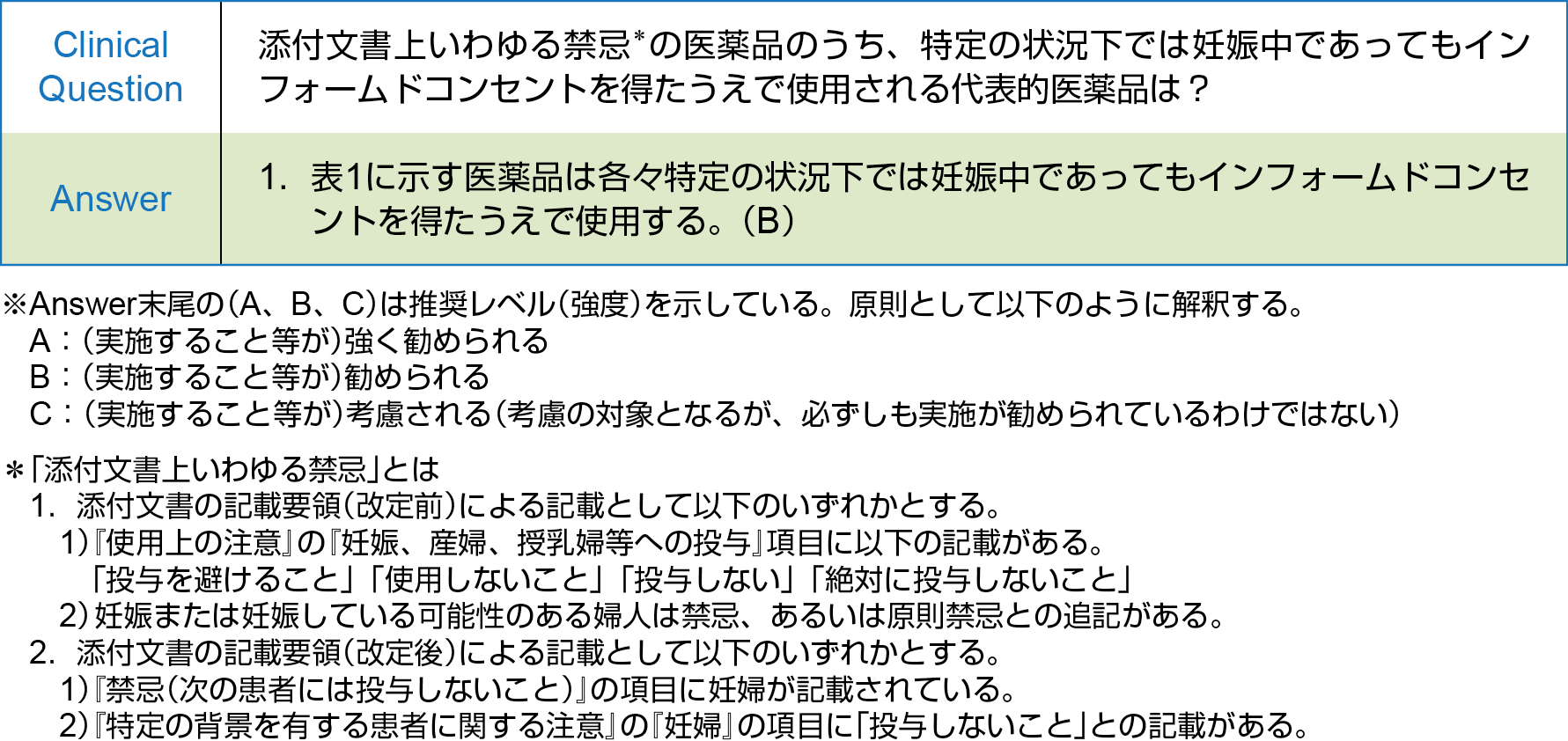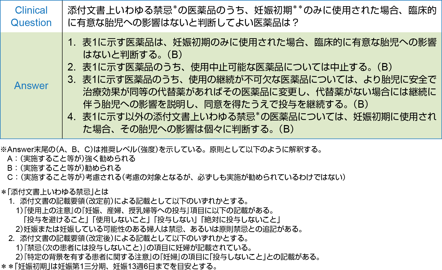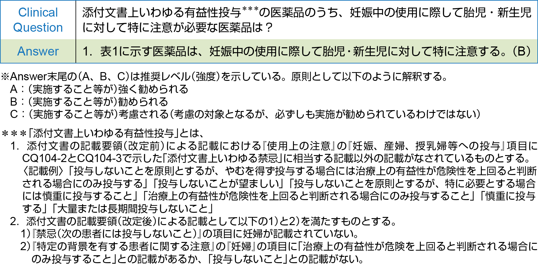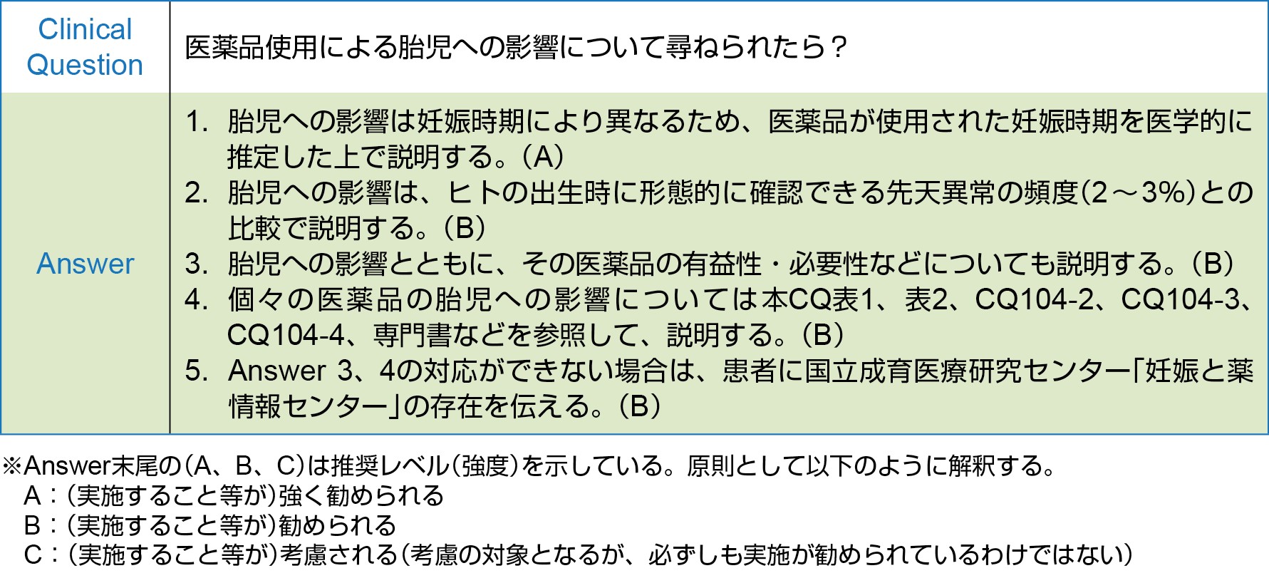 『産婦人科診療ガイドライン-産科編2023』における、妊娠中の薬物使用に関連したClinical Question & Answer(CQ104-1)