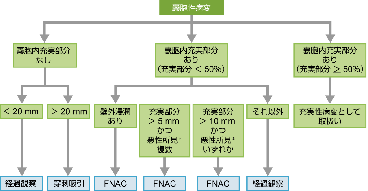 日本内分泌外科学会 甲状腺腫瘍診療ガイドライン作成委員会. 甲状腺腫瘍診療ガイドライン2024. 日内分泌会誌, 2024; 41(Suppl2): 17, アルゴリズム2-2 2) 嚢胞性病変.