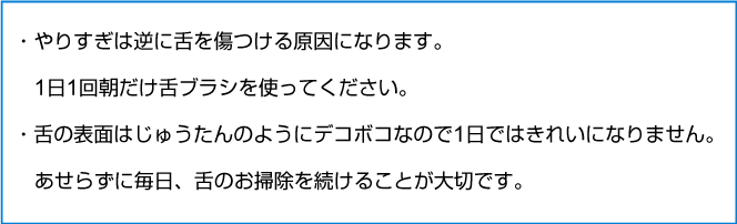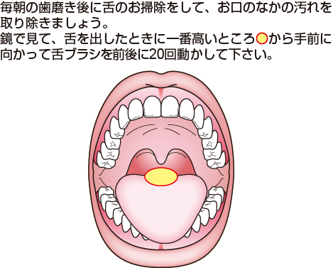 舌背に舌苔付着が認められる。このような場合、まず舌清掃を含む口腔衛生指導行う。