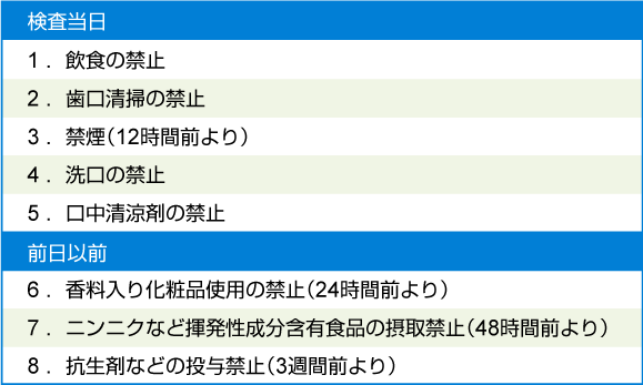 口臭強度は1日のなかでも時間帯や飲食、健康状態などさまざまな条件で大きく変動し、起床直後、ついで空腹時が最も強いといわれている。したがって、飲食、口腔衛生活動および喫煙などの影響を排除し、検査条件を極力統一させるため、表に示す検査条件を設定する(飲食、歯磨き後には、真性口臭症の場合でも、口臭が低く検出される可能性がある)。