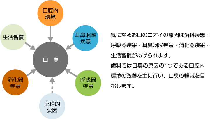 口臭の原因は、歯科疾患・呼吸器疾患・耳鼻咽喉疾患・消化器疾患・生活習慣が挙げられる。様々な原因がある口臭だが、口臭の80%以上は口腔由来であり、その原因物質は揮発性硫黄化合物という物質である。ただし、心因性の口臭も存在する。