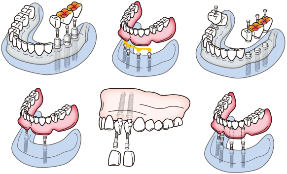 インプラント埋入手術。粘膜骨膜切開を行い、骨面を明示、小さなドリルから大きなドリルへ順次インプラント埋入窩を形成する。インプラントを機械もしくは手指にて埋入していく。縫合して一時手術は終了。