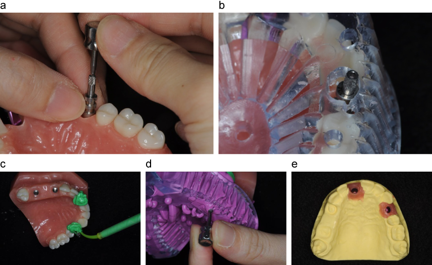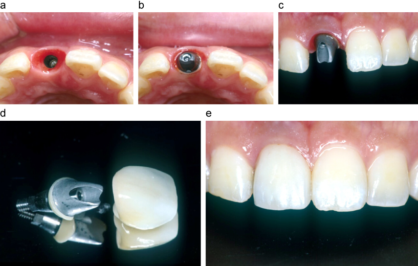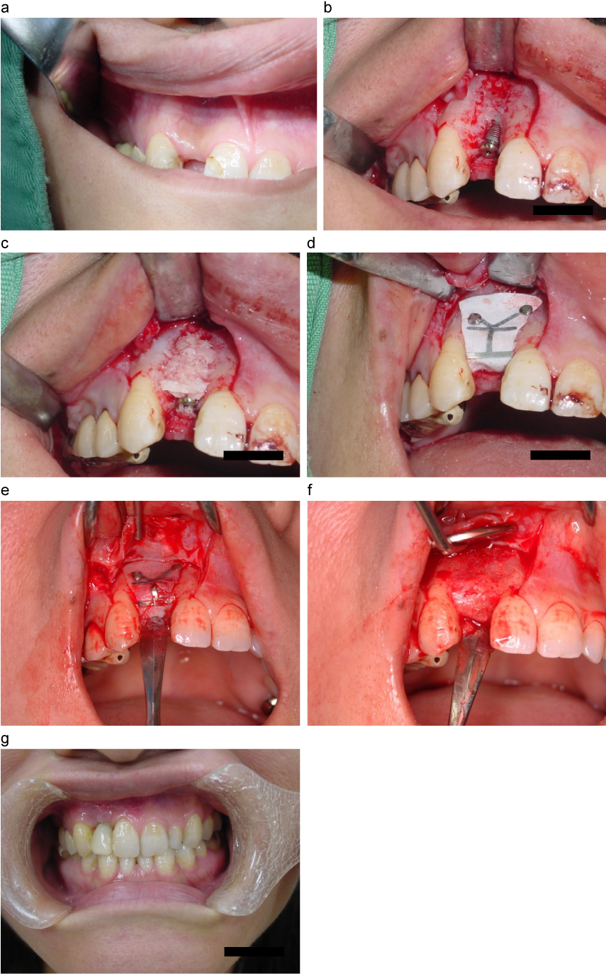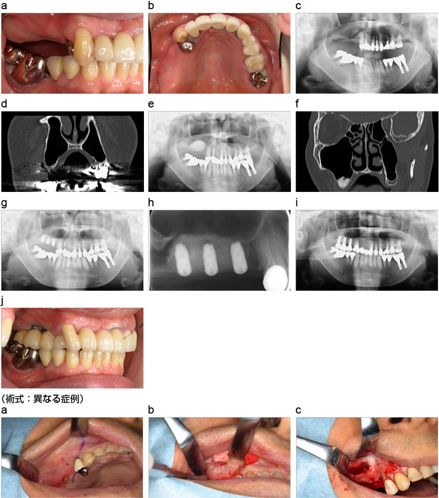 c:骨膜剥離子で粘膜骨膜弁を剥離する d:頬側方向へ必要かつ十分な量を剥離する e:粘膜骨膜弁剥離後の状態