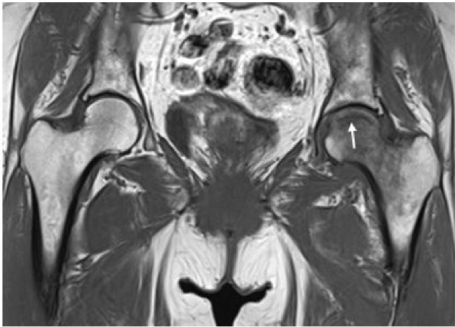 MRI T1強調像(冠状断像)では関節面近傍に中枢に凸の線状低信号像(矢印)や骨頭から頚部に広がる低信号の骨髄浮腫像を認める。