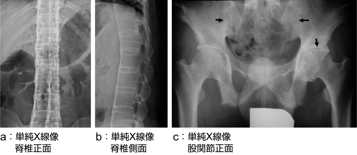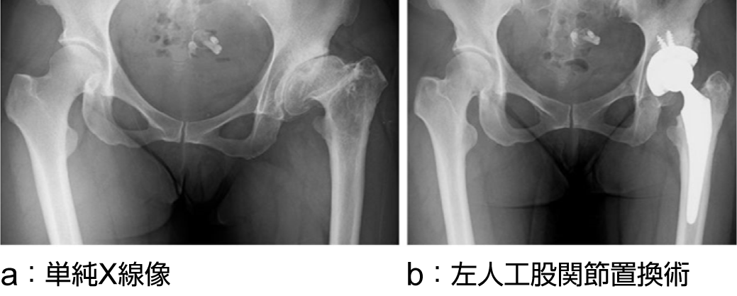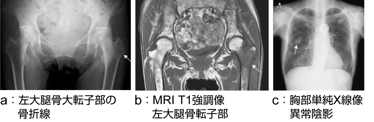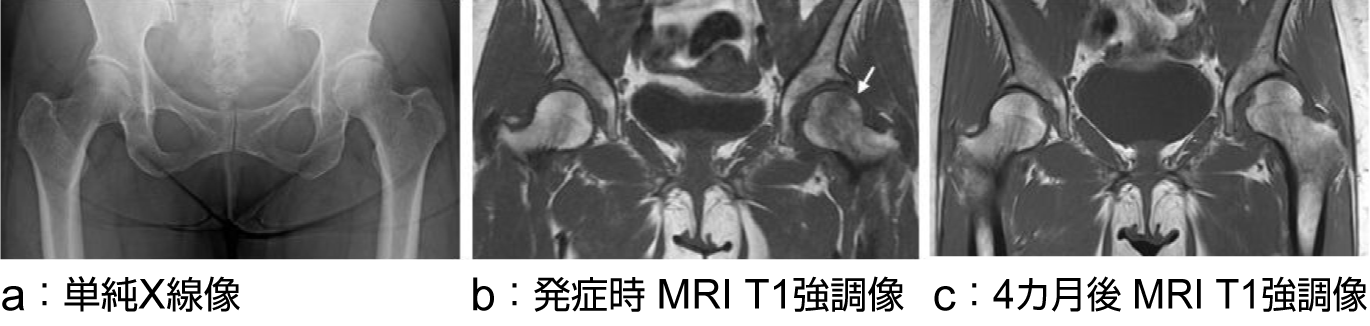 b:MRI T1強調像で、左大腿骨転子部に低輝度領域を認める(矢印)。