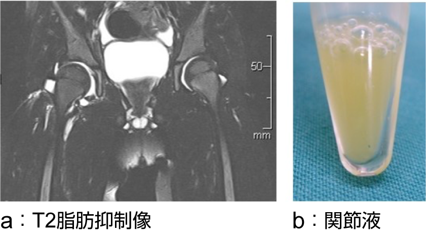 a:MRI T2強調脂肪抑制像で右股関節に関節液の貯留が確認された。