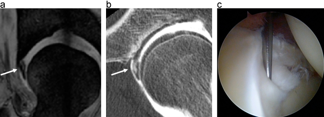a、b:放射状MRIや関節造影後CTの放射状再構成像では、関節唇断裂部に信号変化や造影剤の流入がみられる(矢印)。