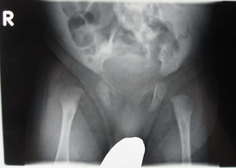 骨頭は未骨化のため観察できないが、右股関節の外方化がみられ、ほぼ脱臼位となっている。