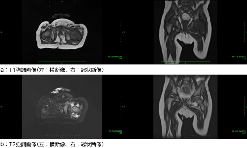 MRIでは、左股関節液の貯留が著明であり、周囲軟部組織と骨髄の炎症所見を認める。