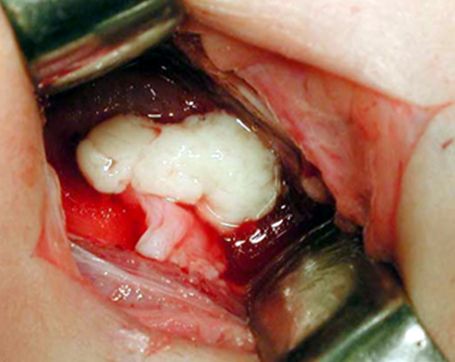 手術にて股関節の切開を行うと、膿の排出がみられる。