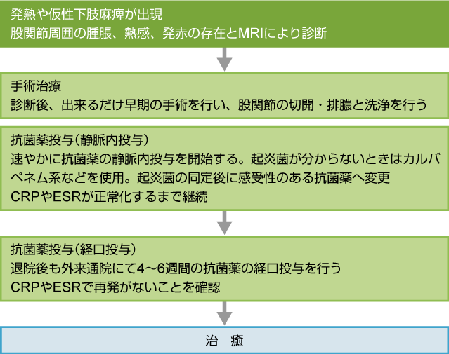 乳児化膿性股関節炎診断後の治療体系では、出来るだけ早期の手術と抗菌薬の投与が必要である。