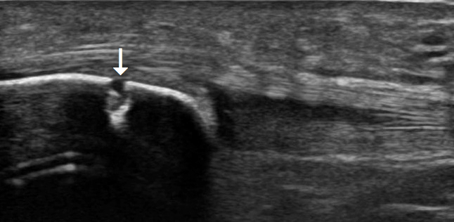 膝蓋骨遠位部に骨皮質の途絶(矢印)が観察される。