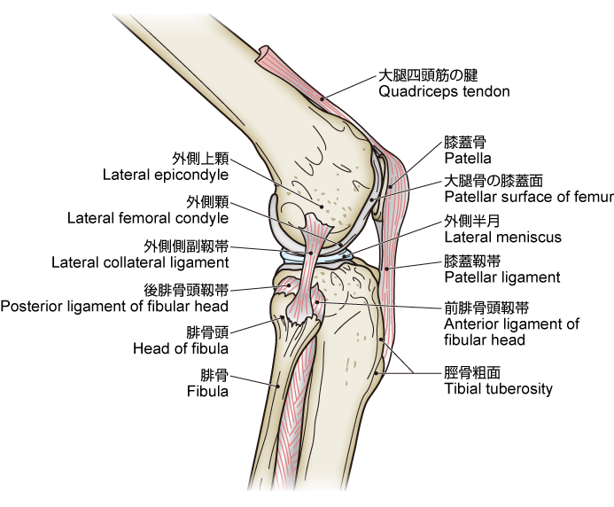 膝関節伸展機構は、大腿四頭筋、膝蓋骨、膝蓋腱、脛骨結節で構成される。