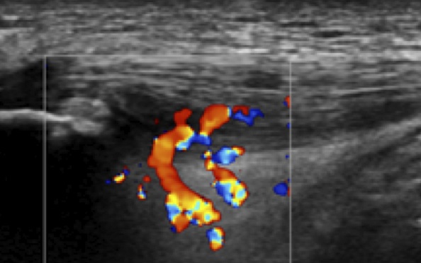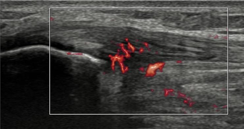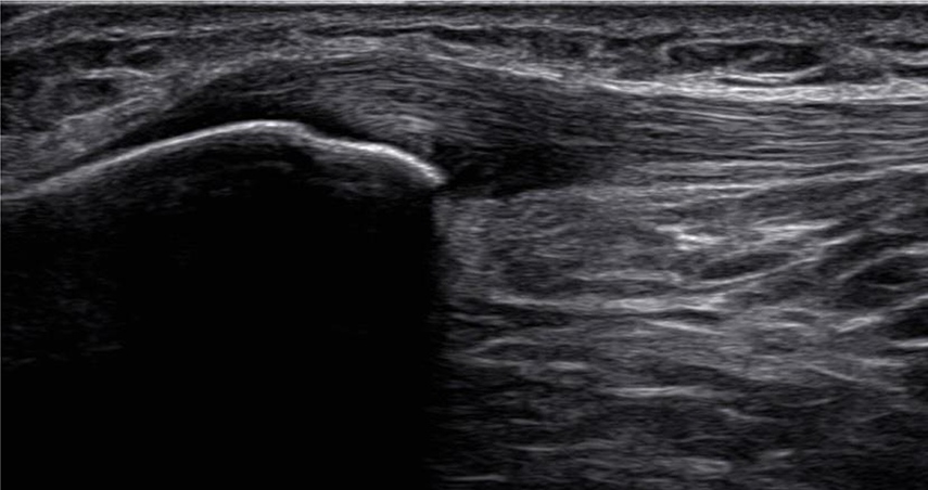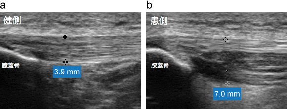 aは正常の膝蓋腱長軸像であり、腱実質はfibrillar patternを呈している。bはジャンパー膝例であり、膝蓋腱近位深層でfibrillar patternの消失が観察される。
