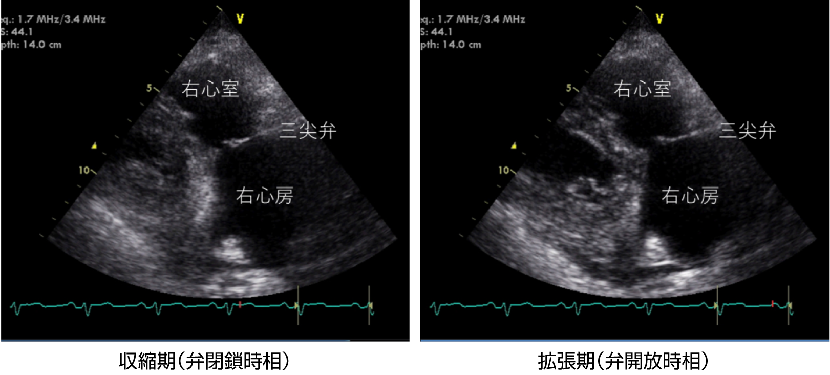 三尖弁は肥厚変性し可動性の消失をきたしており、収縮期には大きな接合ギャップを形成し重症逆流をともなう。拡張期には開放制限があり中等症狭窄を呈する。