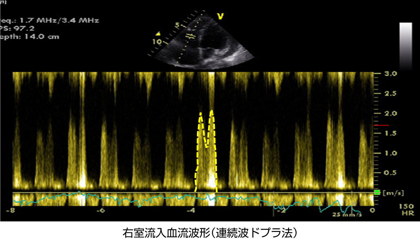 三尖弁は肥厚し可動制限があり、拡張期にも開放が不十分である(弁口面積が減少)。