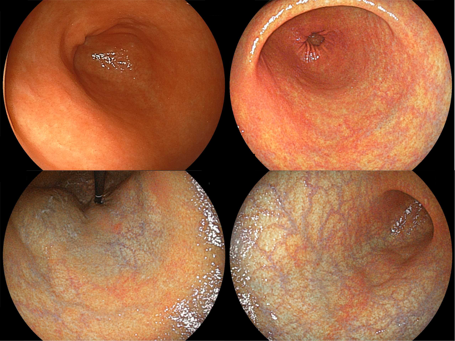 胃体部の粘膜全体に血管の透見像を認め高度の萎縮があり、前庭部には萎縮を認めず典型的なAIGの内視鏡所見である。