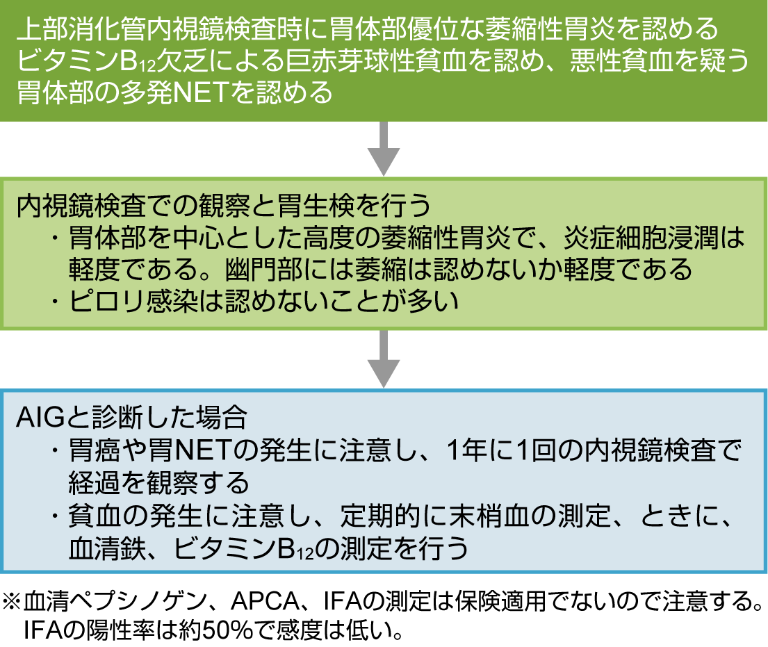 欠乏による巨赤芽球性貧血を認め、悪性貧血と診断したときは内視鏡検査が必須である。胃体部の多発NETを認めたときも、自己免疫性胃炎を考える。