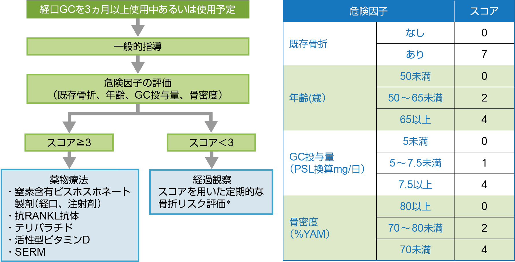 GC:グルココルチコイド、RANKL:receptor activator of nuclear factor kappa B ligand、SERM:選択的エストロゲン受容体モジュレーター、PSL:プレドニゾロン、YAM:young adult mean