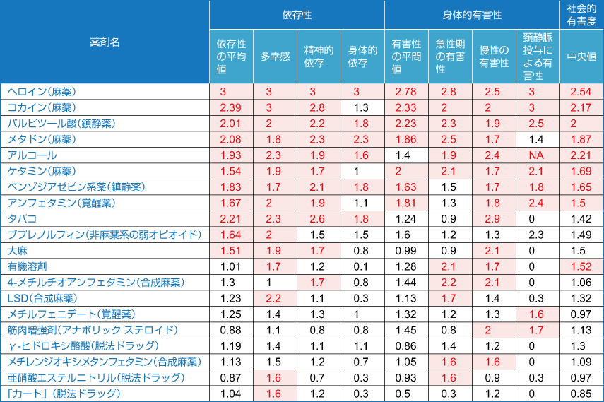 Abstract/Text: Drug misuse and abuse are major health problems. Harmful drugs are regulated according to classification systems that purport to relate to the harms and risks of each drug. However, the methodology and processes underlying classification systems are generally neither specified nor transparent, which reduces confidence in their accuracy and undermines health education messages. We developed and explored the feasibility of the use of a nine-category matrix of harm, with an expert delphic procedure, to assess the harms of a range of illicit drugs in an evidence-based fashion. We also included five legal drugs of misuse (alcohol, khat, solvents, alkyl nitrites, and tobacco) and one that has since been classified (ketamine) for reference. The process proved practicable, and yielded roughly similar scores and rankings of drug harm when used by two separate groups of experts. The ranking of drugs produced by our assessment of harm differed from those used by current regulatory systems. Our methodology offers a systematic framework and process that could be used by national and international regulatory bodies to assess the harm of current and future drugs of abuse.