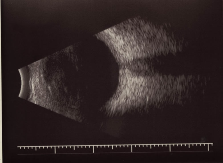 急性期原田病におけるB‐モード所見。著明な脈絡膜浮腫が観察できる。