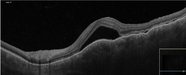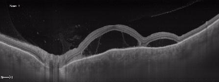 急性期原田病におけるOCT所見。隔壁を伴った漿液性剝離、脈絡膜肥厚が観察できる。