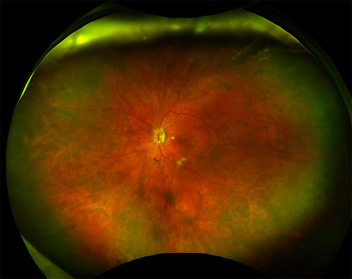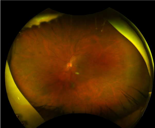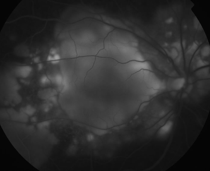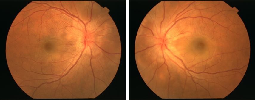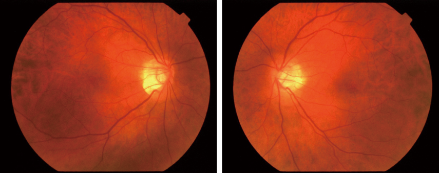 発症3カ月後。両眼に夕焼け状眼底を認める。