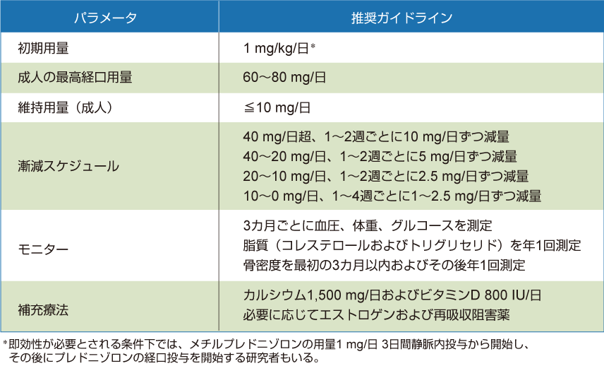 ステロイド薬全身治療を行う場合の初期投与量と減量プランについては一般的に上図のように推奨されている。全身管理についても定期検査を行う必要がある。