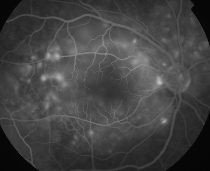 急性期の原田病症例におけるFA初期像。点状の蛍光色素が漏出してきている。